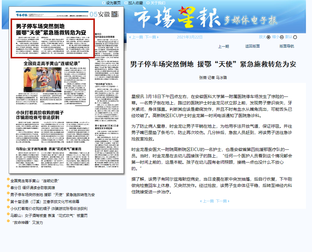 市场星报、中安在线:男子停车场突然倒地 援鄂“天使”紧急施救转危为安