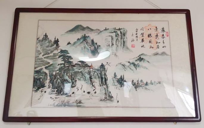 走进浦老家的客厅,一幅高山流水、意境深邃的水墨画立刻吸引了我们。图画中远处山峰巍峨,近处树木青翠茂盛,参天松柏栩栩如生,一片宁静壮美的江山风景尽展眼前。浦老爱人黄景秀老人告诉我们,画上的山就是她老家的后山,画上的路就在老宅的屋后。