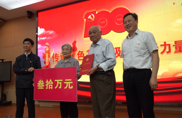 浦海鸿说,正值中国共产党诞生100周年,老夫妻俩边学习、边回忆,觉得参加工作时勤勤恳恳、兢兢业业的为人民服务是一生应尽的责任,痛快地完成了党和组织交给的任务。离开工作岗位后,浦老感动于党的温暖和学校的关怀,让夫妻俩安享幸福快乐的晚年生活。但总有遗憾,觉得离休三十年来自己没能再为社会、为学校做出贡献。党史是最好的教科书,通过学习党史,先烈们英勇作战、顽强拼搏的画面再次浮现在眼前,为感念党恩,浦老经过认真考虑,决定将积攒多年的离休金共计30万元捐赠出来,以实际行动庆祝中国共产党成立100周年。