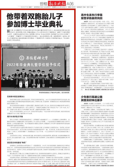 新安晚报:他带着双胞胎儿子参加博士毕业典礼