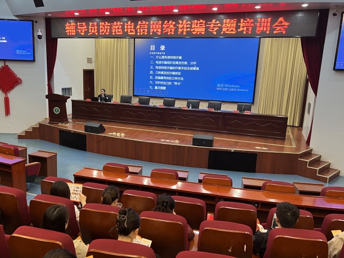 4月2日下午,校保卫处、学生处联合三里庵派出所、梅山路社区,在学校图书馆第一学术报告厅举办辅导员防范电信网络诈骗专题培训会。