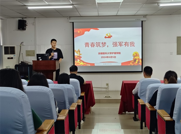 6月5日下午,护理学院开展征兵政策宣讲会,贯彻落实习近平强军思想,激发青年学生积极投身国防事业的雄心壮志。该院党委书记薛磊作政策宣讲,院党委副书记王磊主持会议。