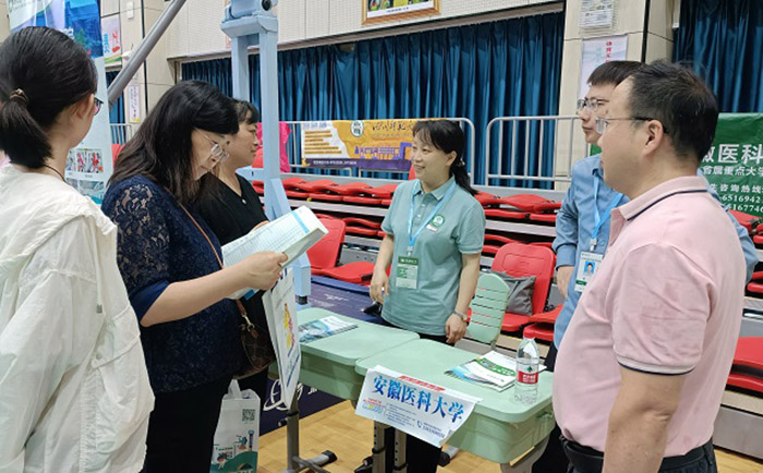 招生宣传组由该院领导班子成员、各教研室负责人带队,分六个小组,分别前往合肥、宿州、淮北、亳州、阜阳、六安、滁州、马鞍山、芜湖、安庆、池州、蚌埠等地的40余所中学进行宣讲。从高招会到咨询会,从线上直播到线下面对面,各地招生宣传组顶着烈日、冒着大雨,结合学校的招生宣传材料,详细为各地考生及家长介绍安医大的专业特色、学科优势、教学设施、师资团队、毕业就业等各方面信息,重点说明了安徽省新高考政策落地后学校的招生政策,并耐心细致答疑解惑。该院副院长王峰松及学院部分教师代表还参与了线上直播招生宣讲。