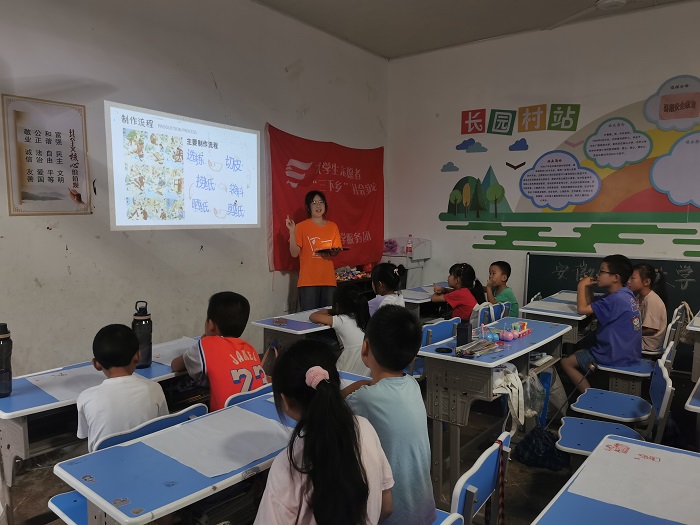 非遗手工课堂,文化浸润童心。实践队前往泾县长园村综合文化服务中心,聚焦“宣纸文化,为乡村的小朋友们带去了一场别开生面的传统文化探索之旅。课堂上,通过生动讲述、图片展示以及互动问答,队员们向小朋友们介绍了宣纸的生产过程及宣纸文化的时代价值,带领他们一起铺压黄底宣纸、手持纤毫毛笔,感受油墨在纸间流动氤氲的魅力。队员们还为小朋友们送上了自制的宣纸书签、印章等礼物,提升孩子们对中华优秀传统文化的兴趣与热爱,将文化自信“种”在孩子们的心间。