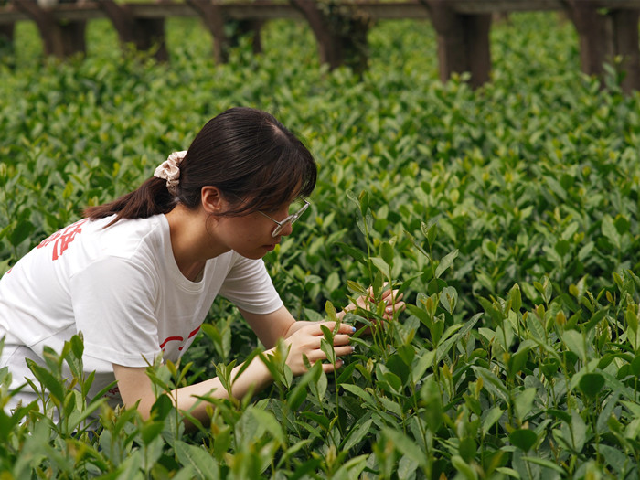 “九一六”茶园内,实践团成员同茶农交流经验,通过亲身的劳动实践积累经验、磨炼意志。在茶园负责人带领下,实践团成员参观了油茶展览厅和种植基地,最新的种植技术让青年学子们意识到,科技创新是乡村振兴的“催化剂”和“加速器”。