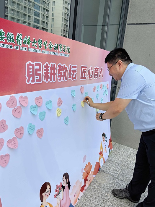 活动中,教职工们在“躬耕教坛 匠心育人”的主题板上,纷纷贴上写有自己感悟和祝福的心愿便利贴。该院优秀教师代表韩毛振副教授回顾了来院任教的5年时光。他表示,正是一代又一代的师道传承激励鼓舞自己,要始终坚定以学生为中心的理念,坚持立德树人。