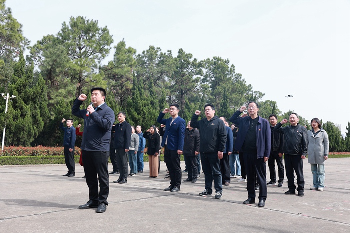 随后,院党委书记凌春笋带领全体人员面对鲜红党旗,重温入党誓词。伴随着深沉悠长的《献花曲》,4名党委中心组成员代表手抬花篮缓步前进,将花篮整齐排列在纪念碑基座前。凌春笋和院长谢栋栋缓步来到纪念碑前,在花篮前驻足凝视,仔细整理花篮缎带。参加仪式的全体人员面向纪念碑深深三鞠躬,向革命先烈表达崇高敬意,并一一上前缓步绕行,向革命烈士敬献鲜花,瞻仰纪念碑。