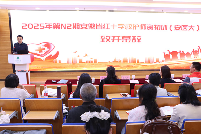 安徽省红十字会赈济救护部三级调研员、备灾救灾中心副主任王剑锋出席并致辞。他充分肯定我校在全省医学教育的引领作用,希望学员以高度的责任感投身应急救护事业,传递“人道、博爱、奉献”的红十字精神。