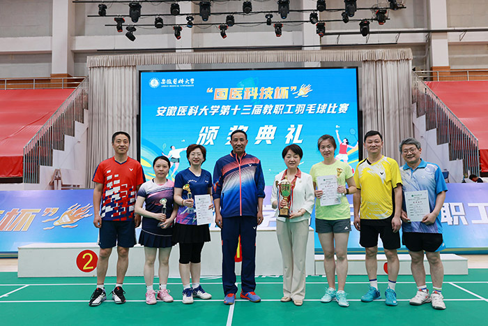 5月10日至11日,由校工会主办,医学人文学院、校团委、社会合作处协办的“国医科技杯”第十三届教职工羽毛球比赛在校本部体育馆举行。校党委书记王琦出席开幕式并全程参加比赛,校党委副书记、第一附属医院党委书记徐朝阳参加比赛,并出席闭幕式为获奖单位和个人颁奖,校党委常委、医学人文学院党委书记顾秀平主持开幕式并出席闭幕式为获奖单位和个人颁奖。安徽中技国医医疗科技股份有限公司董事长丁贞虎出席比赛并致辞,校工会主席李群致开幕辞。学校各分工会、直属附属医院的20支代表队近300名教职工参加比赛。